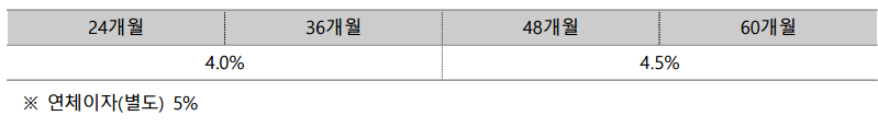 2. 대출조건 : 24개월부터 60개월 이내에서 기업이 자율적으로 선택 (연 4.0 ~ 4.5% 고정금리)